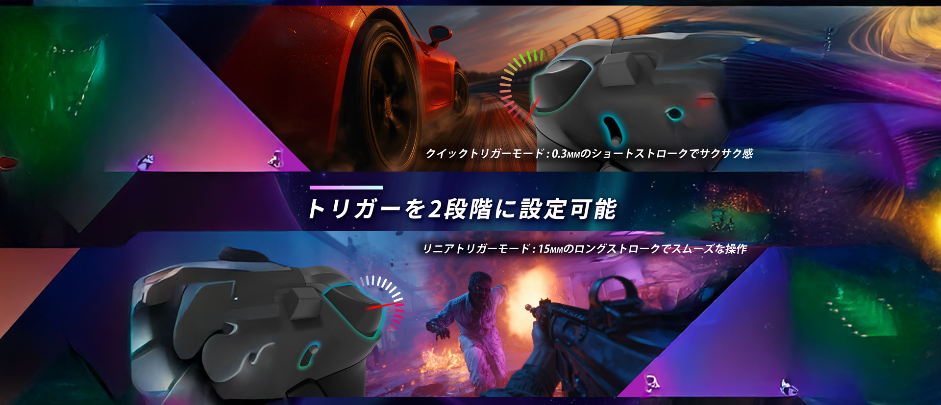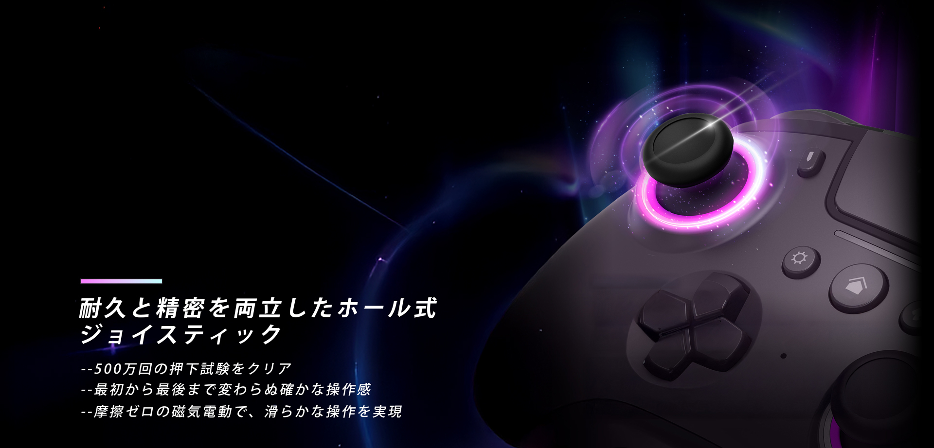| 特徴 | ポーリングレート1000Hz(有線接続時のPCのみ対応) RGBライティングを搭載し、ゲームプレイの没入感をさらに高めます。 ホール効果センサー仕様のアナログトリガー トリガーストップ機構搭載 ホール効果センサー仕様のジョイスティック採用:ドリフトを抑制/摩擦ゼロの磁気伝導/500万回耐久で、操作感は常に安定。 メカニカルボタン採用:従来比30%高速反応/0.7mm短ストローク/400万回耐久 マクロ(Macro)とターボ(Turbo)連射に対応。ボタンを割り当ててワンタッチで連続入力できます。 滑り止め効果の高い表面加工と肌触りの良い素材を組み合わせ、しっかり握れて滑りにくく、長時間のプレイでも快適です。 | |